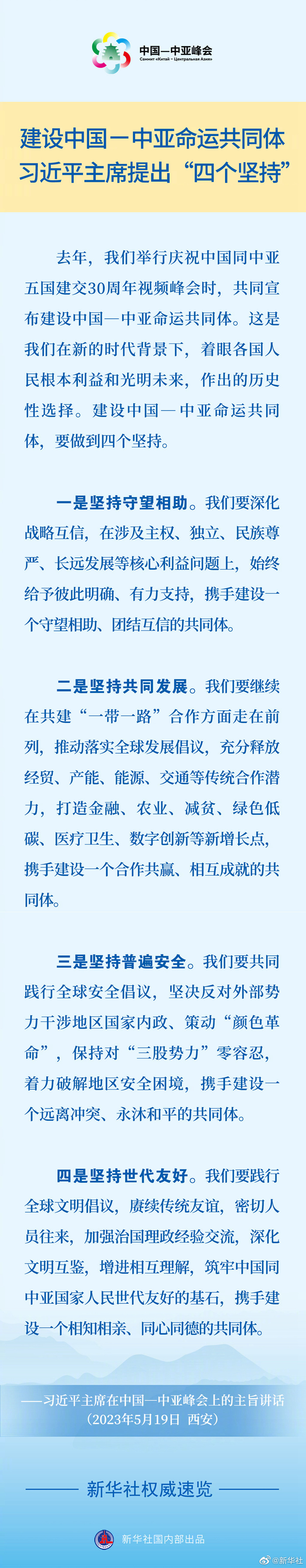 5月19日,國(guó)家主席習(xí)近平在中國(guó)—中亞峰會(huì)上發(fā)表主旨講話,就建設(shè)中國(guó)—中亞命運(yùn)共同體,提出要做到“四個(gè)堅(jiān)持”。