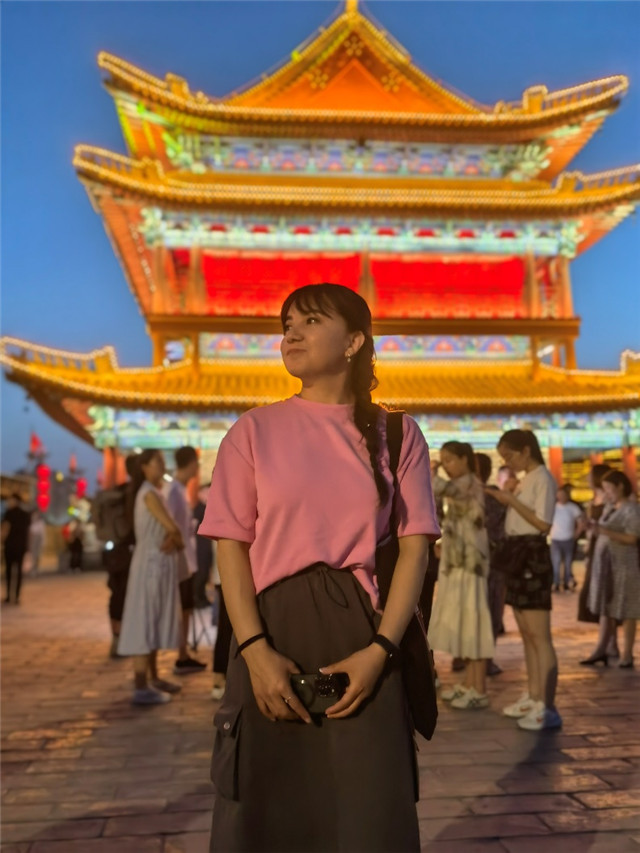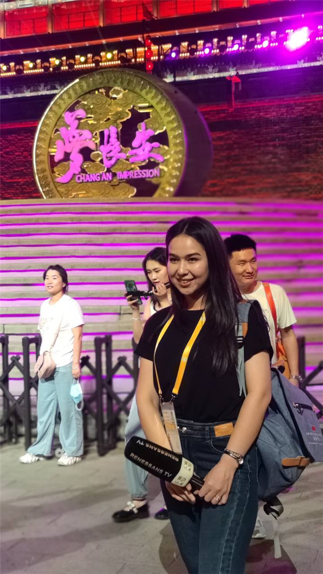 | 哈薩克斯坦BAQ.KZ通訊社記者古麗詹參觀西安夜景。受訪者供圖 |