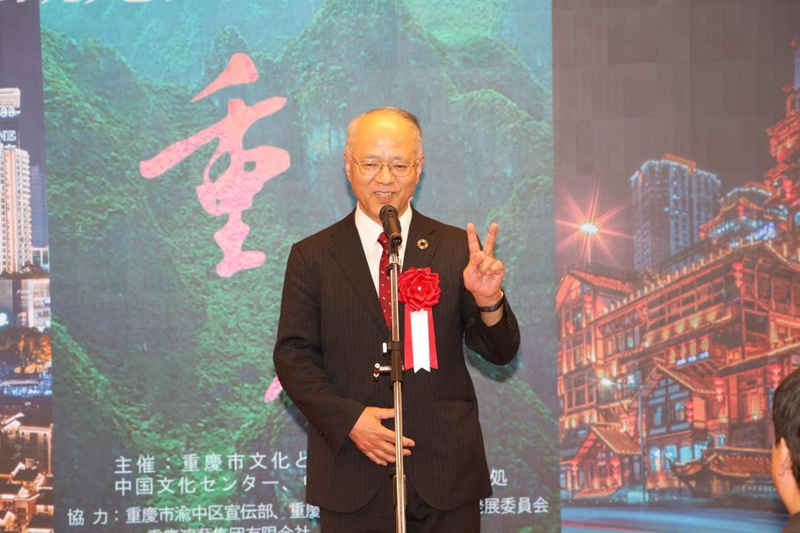 前日本駐重慶總領(lǐng)事、日中協(xié)會理事長瀨野清水用流利的中文致辭。他說:“重慶名字喜慶,好事不僅一個,最起碼有兩個,所以叫‘重慶’。中國唐代大詩人杜甫有詩云‘潤物細無聲’,觀光旅游就是能起到萬物入心的無聲作用。我對重慶非常懷念,有機會讓我們一起到重慶去吧!”