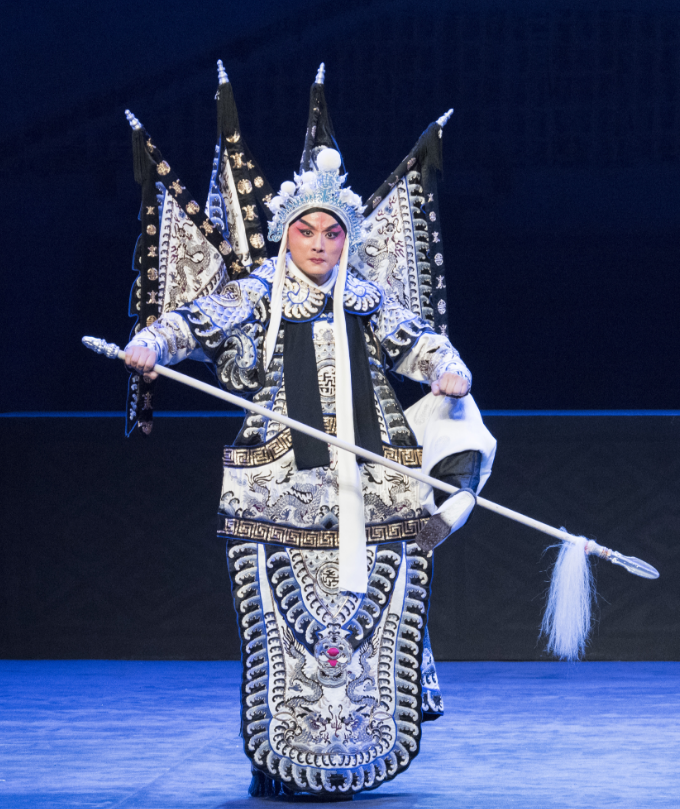 在此次奪梅劇目《馬超》中,唐愷以穩(wěn)重、沉著的功架和腰腿功,融合長靠、厚底、短打、薄底,腿功、腰功、各種蹉步翻身、騰空的翻打跌撲、靠旗的抖揉轉撞和高難度的拋槍、耍槍、轉槍、背槍、繞槍,快節(jié)奏地涮腰旋轉、擰腿翻身等功法技巧,將“馬超”這一角色完美地呈現(xiàn)展示在舞臺上。
