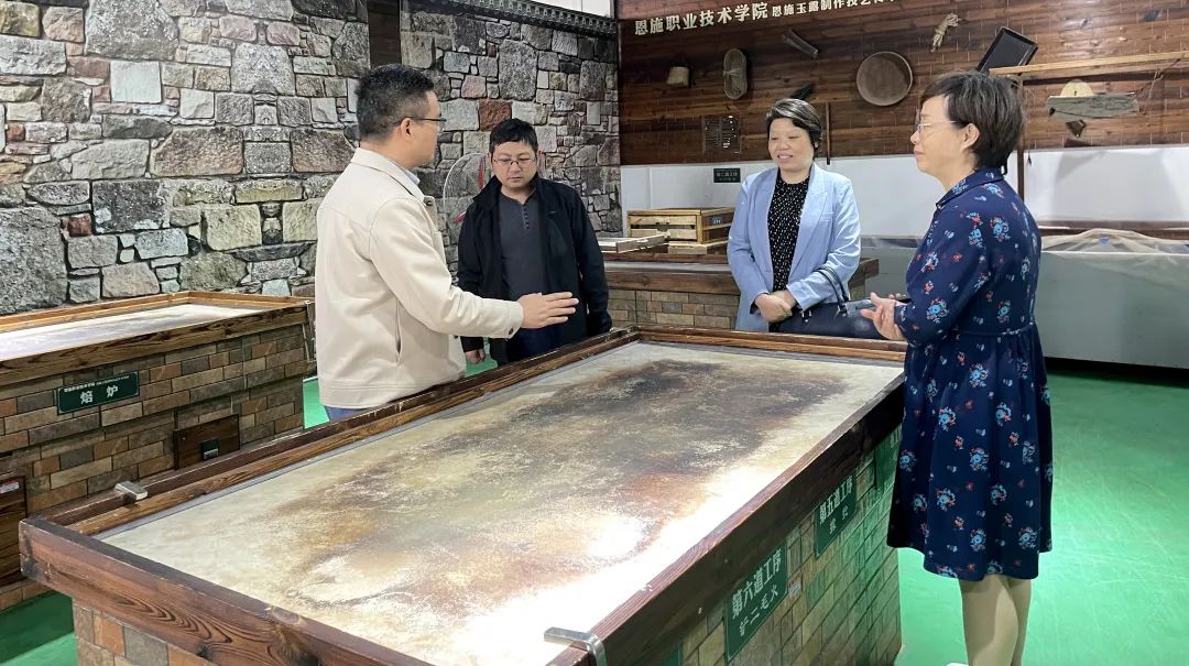 期間,評估小組一行赴恩施職業(yè)技術(shù)學(xué)院-恩施玉露制作技藝傳承培訓(xùn)基地現(xiàn)場調(diào)研。隨后,在恩施市非遺中心與恩施市國家級、省級非遺代表性傳承人召開座談會,對恩施市非遺代表性傳承人及傳承基地開展傳承培訓(xùn)和宣傳推廣工作給予肯定,評估小組一行鼓勵代表性傳承人進一步開展宣傳展示活動,并為寶貴的非物質(zhì)文化遺產(chǎn)項目多培養(yǎng)后繼人才。