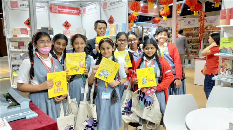 | 在阿布扎比國際書展現(xiàn)場,阿聯(lián)酋當(dāng)?shù)貙W(xué)生與《輕松學(xué)中文》新書合影。 |