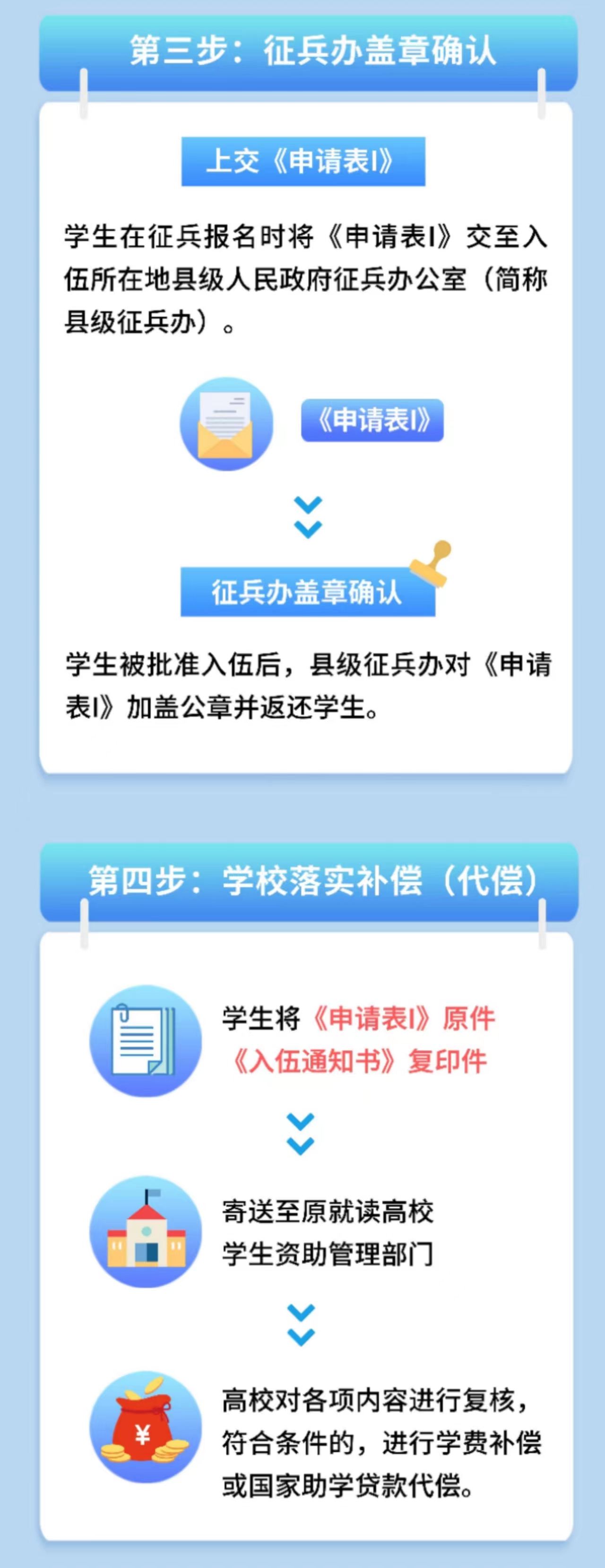 ① 國家對應征入伍服義務兵役、招收為軍士的高校學生,在入伍時對其在校期間繳納的學費實行一次性補償或用于學費的國家助學貸款實行代償;