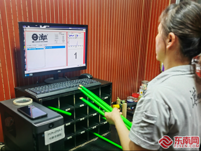 在漢旗樂(lè)器的音高配對(duì)室里,只見(jiàn)技術(shù)工人從一大堆同級(jí)的鼓棒中,每次拿出10根對(duì)著辨音器進(jìn)行敲打,設(shè)備馬上進(jìn)行音質(zhì)分析、配對(duì),并迅速在電腦顯示屏上顯示出配對(duì)結(jié)果。