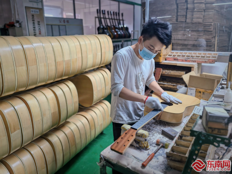 昱恒樂(lè)器車間里,工人正在制作吉他。 東南網(wǎng)記者 林永清 攝