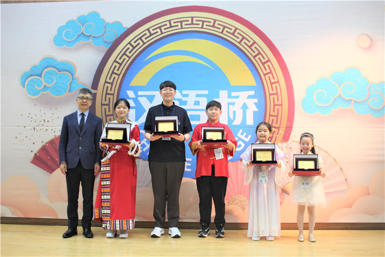 中國駐韓大使館公使參贊艾宏歌為大學(xué)生組、中學(xué)生組和小學(xué)生組冠軍頒獎(jiǎng)。首爾孔子學(xué)院供圖