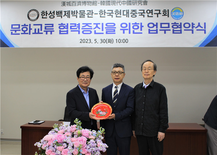 人民網(wǎng)首爾5月31日電 (記者馬菲)5月30日,韓國現(xiàn)代中國研究會“漢語橋”俱樂部首爾中心與首爾市立漢城百濟博物館舉行簽約儀式,雙方就共同開展學術研討、聯(lián)合調研、文化展覽、人員交流和教育培訓,以及在共享文獻資料、場地設施等方面達成合作協(xié)議。韓國現(xiàn)代中國研究會會長金學俊、漢城百濟博物館館長俞炳夏、現(xiàn)代中國研究會副會長李浚植、中國駐韓國大使館公使銜參贊艾宏歌等出席簽約活動。
