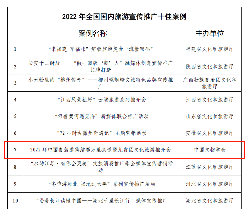 由萬里茶道聯(lián)合申遺辦策劃,萬里茶道沿線九?。▍^(qū))文化和旅游廳(文物局)主辦,萬里茶道聯(lián)合申遺辦、中國文物交流中心、中國文物學(xué)會文物旅游專業(yè)委員會、中國古跡遺址保護(hù)協(xié)會文化線路專業(yè)委員會共同支持,湖北省文物事業(yè)發(fā)展中心、環(huán)中國自駕游集結(jié)賽組委會、北京江湖國際旅游有限公司聯(lián)合承辦,中國文物學(xué)會報送的“2022’萬里茶道——環(huán)中國自駕游集結(jié)賽暨九省區(qū)文化旅游推介會”獲評十佳案例(第七名)。