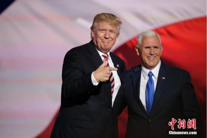 當?shù)貢r間2016年7月20日,美國俄亥俄州克利夫蘭,特朗普和彭斯同臺亮相共和黨全國代表大會。中新社記者 廖攀 攝