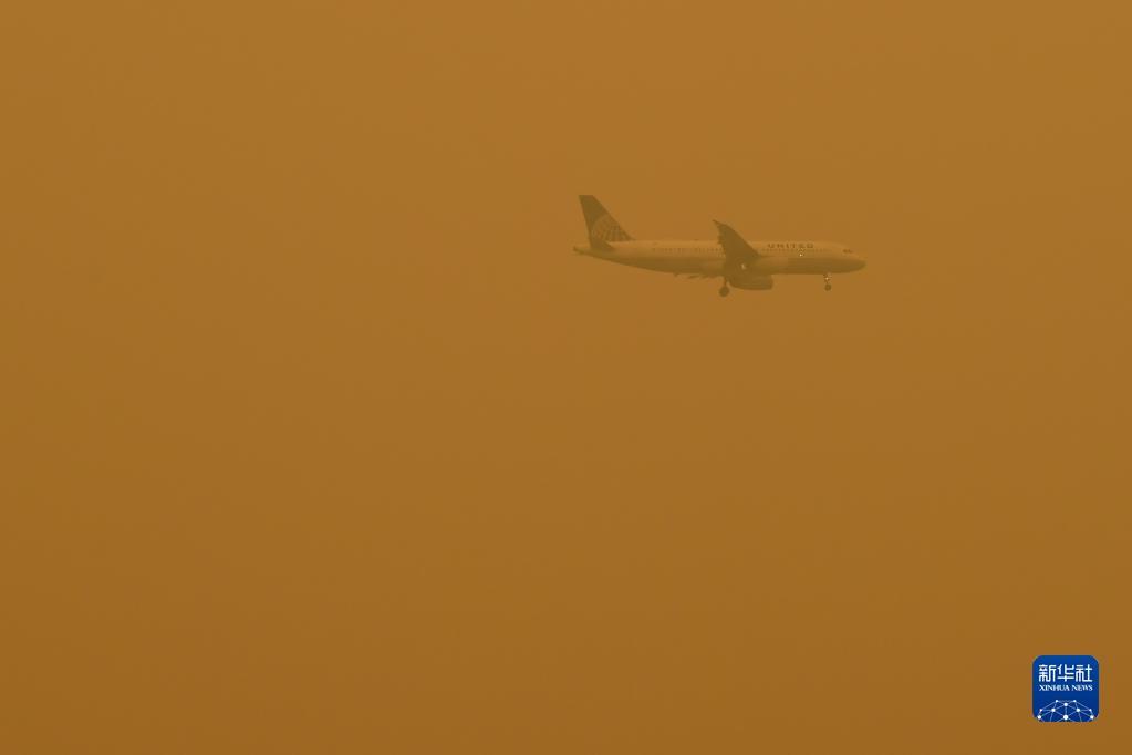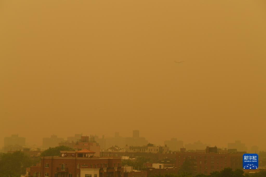 6月7日,一架飛機(jī)從煙塵籠罩的美國紐約上空飛過。新華社記者 李睿 攝