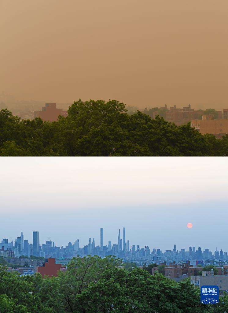 這張拼版照片顯示的是煙塵籠罩下的美國紐約(上圖,6月7日攝)和受煙塵影響前的紐約(下圖,5月21日攝)。新華社記者 李睿 攝
