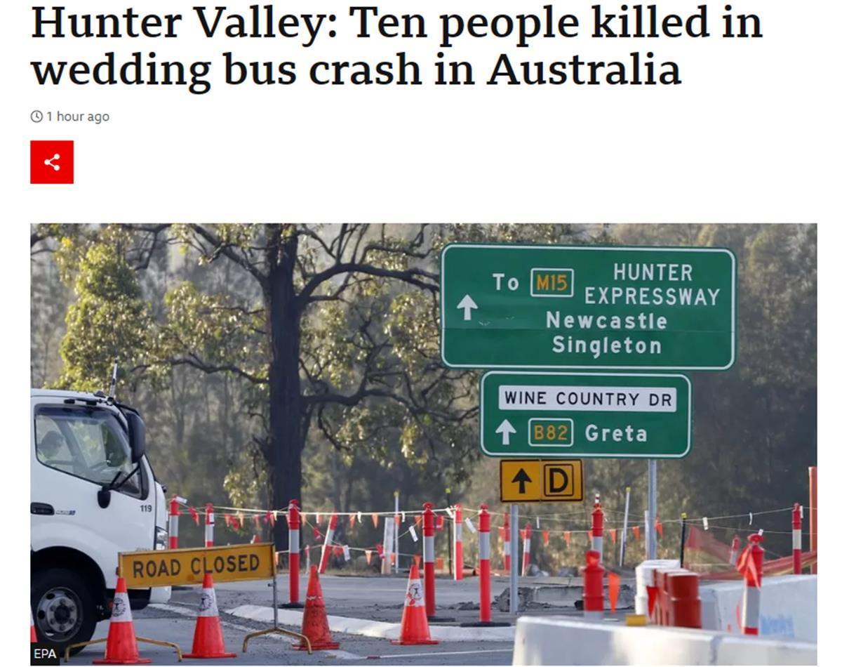 綜合《衛(wèi)報》、英國廣播公司等媒體報道,當(dāng)?shù)貢r間6月11日晚,澳大利亞新南威爾士州發(fā)生一起交通事故,一輛載有約50人的大巴車在一個環(huán)形交叉路口突然翻車。截至目前,事故共造成10人死亡、25人受傷。