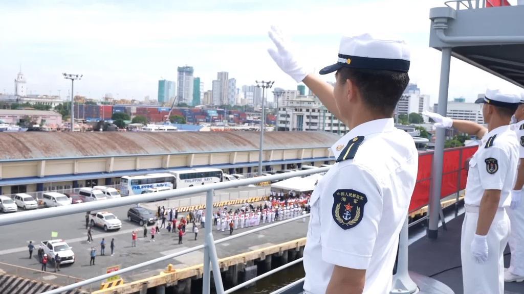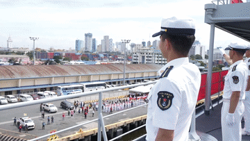 當(dāng)天早上,懸掛中菲兩國(guó)國(guó)旗的戚繼光艦航行至馬尼拉港外海,與菲方艦艇會(huì)合,進(jìn)行過(guò)航演練。演練結(jié)束后,戚繼光艦緩緩駛進(jìn)馬尼拉港。