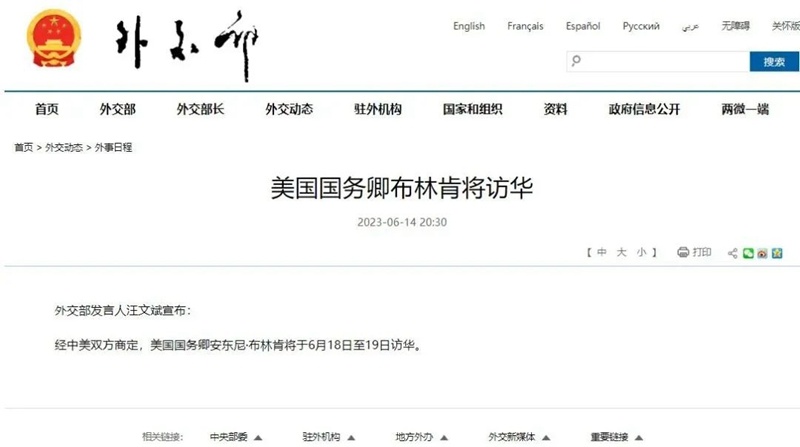 來看這條短消息:經中美雙方商定,美國國務卿安東尼·布林肯將于6月18日至19日訪華。外交講的是細節(jié),“經中美雙方商定”,這幾個字意味深長……