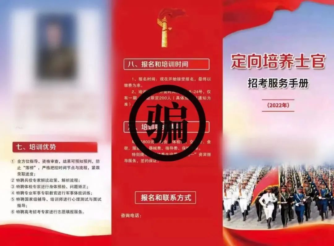 部分“培訓(xùn)機(jī)構(gòu)”甚至某些“院校”,利用考生和家長(zhǎng)對(duì)政策不了解,通過制作發(fā)放宣傳冊(cè)進(jìn)行虛假招生宣傳。這些宣傳冊(cè)封面大都與征兵宣傳冊(cè)很相似,封面上印有“參軍”“入伍”“畢業(yè)后直接成為軍士”等字樣,還融入了軍徽等軍旅元素,報(bào)考條件甚至需要提供政治考核表等,以此為噱頭索要高額學(xué)費(fèi)。