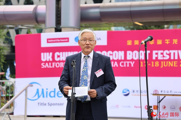 中國駐曼徹斯特總領(lǐng)館副總領(lǐng)事楊治宇宣讀了中國駐英國大使鄭澤光對本次活動(dòng)發(fā)來的賀信,賀信中說,端午節(jié)是中華民族的傳統(tǒng)佳節(jié),歷經(jīng)千載歲月傳承至今。賽龍舟是端午節(jié)的象征,生動(dòng)體現(xiàn)了中華民族堅(jiān)韌不拔、團(tuán)結(jié)奮斗、頑強(qiáng)拼搏的精神內(nèi)涵和文化特質(zhì)。舉辦龍舟會(huì)慶祝端午節(jié),既體現(xiàn)了對美好生活孜孜不倦的向往與追求,也是向中英友好事業(yè)的開拓者們致敬。希望兩國各界有識之士攜起手來,共同弘揚(yáng)龍舟文化精神,打造更多交流合作新亮點(diǎn),增進(jìn)民心相通和民間友好,推動(dòng)中英關(guān)系行穩(wěn)致遠(yuǎn)。
