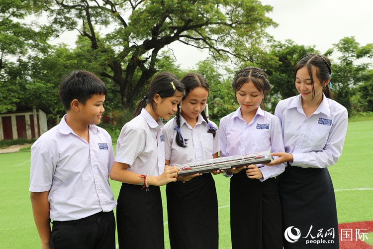 | 萬象宗佩中學(xué)學(xué)生興致勃勃地觀看中老鐵路動車模型。人民網(wǎng)記者 孫廣勇攝 |