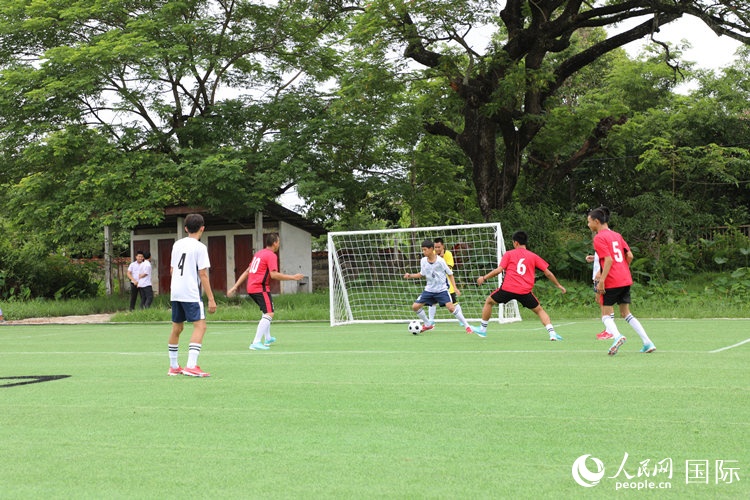揭牌儀式后,“中老友誼之橋”足球場迎來首場比賽,宗佩中學(xué)小球員們展開激烈角逐。啦啦隊熱情高漲,歡呼加油,比賽現(xiàn)場氣氛熱烈,掀起了夏日里的“足球熱浪”。