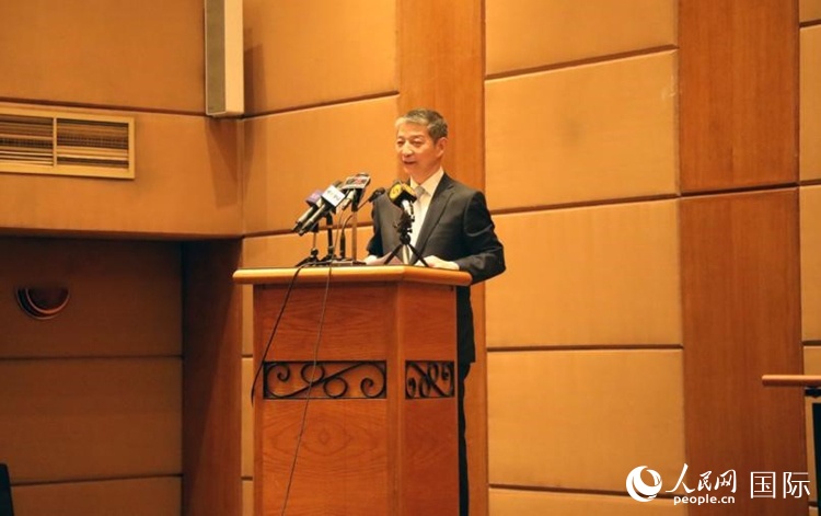 中國駐埃及大使廖力強現場發(fā)言。人民網記者 沈小曉攝