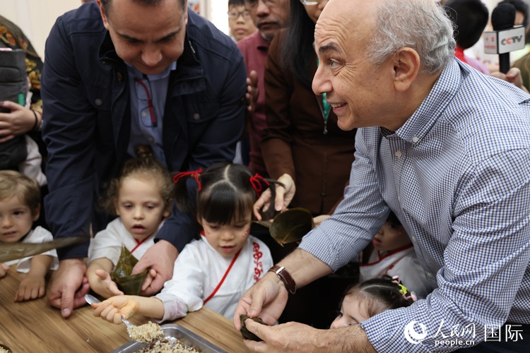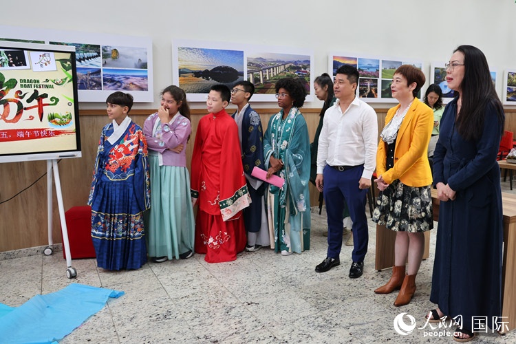 人民網(wǎng)里約熱內(nèi)盧6月19日電 (記者時元皓、宋亦然)“五月五,過端午,劃龍舟,敲大鼓……”當?shù)貢r間6月19日,在音樂的伴奏下,穿著中國傳統(tǒng)服飾的小朋友在里約中國國際學校的小禮堂中齊聲唱著關于端午節(jié)的兒歌。這是該校舉辦的慶祝端午節(jié)活動的一個場景。中國駐里約熱內(nèi)盧總領事田敏,該校校董會董事長、巴西中國浙江商會會長鄭俠茂等出席活動。