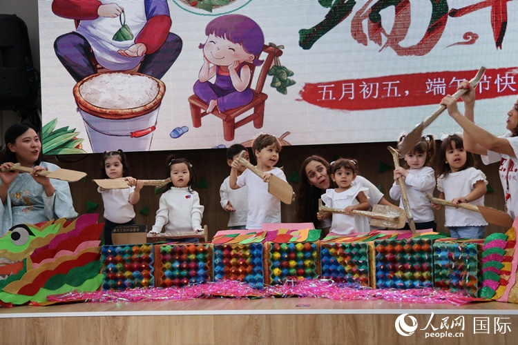 除了演唱中文歌曲、背誦中國古詩名篇外,該校高年級學生還在老師的帶領下自導自演了有關端午節(jié)來源的中文短劇,生動展示了愛國詩人屈原以身殉國投入汨羅江的故事以及后人包粽子、賽龍舟等紀念活動的來歷,引得現(xiàn)場觀看的家長和老師掌聲連連。表演活動結束后,師生、家長共同體驗了包粽子,感受傳統(tǒng)民俗魅力。