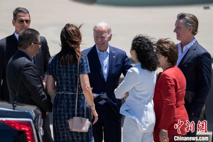 當(dāng)?shù)貢r間6月19日,美國總統(tǒng)拜登抵達(dá)位于加利福尼亞州舊金山灣區(qū)的莫菲特聯(lián)邦機(jī)場,并與加州州長紐瑟姆(右一)等迎接人員簡短交談。 中新社記者 劉關(guān)關(guān) 攝