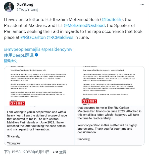 6月21日,自曝“在馬爾代夫遭性侵”的中國女生發(fā)帖表示,已致函馬爾代夫總統(tǒng)易卜拉欣·穆罕默德·薩利赫和議長穆罕默德·納希德,就強(qiáng)奸事件尋求幫助。