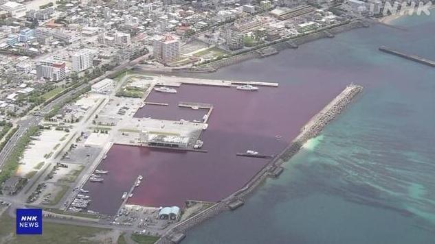 當?shù)貢r間27日上午,日本沖繩縣名護市的一家啤酒廠發(fā)生冷卻水泄漏事故,導(dǎo)致附近大面積海域被染紅。圖片來源:日本放送協(xié)會(NHK)報道截圖