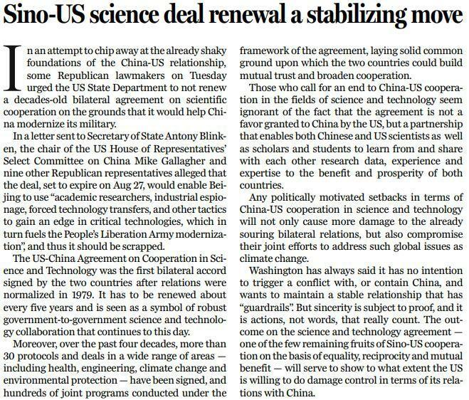 作為1979年中美建交后簽署的首批政府間協(xié)定之一,《中美科技合作協(xié)定》一直被視為兩國科技合作的重要象征。該協(xié)定每5年續(xù)簽一次,40余年來從未間斷。令人匪夷所思的是,美國眾議院“中國問題特別委員會(huì)”主席加拉格爾和另外9名共和黨議員敦促布林肯不要續(xù)簽該協(xié)定,理由是它有助于中國實(shí)現(xiàn)軍事現(xiàn)代化。