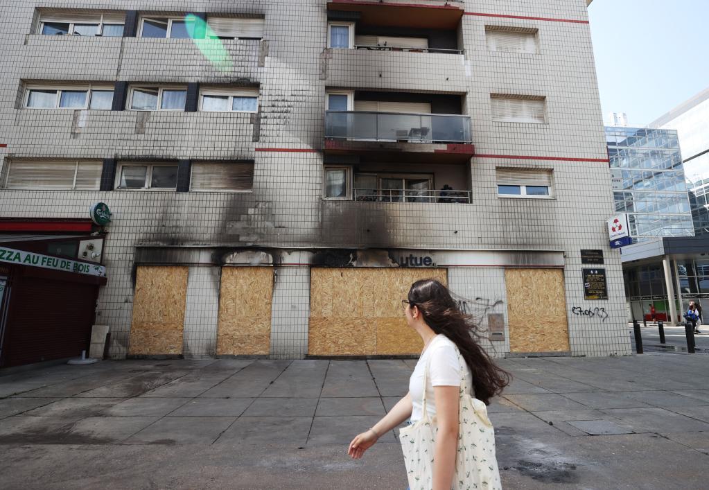 6月30日,在法國(guó)上塞納省楠泰爾市,一家銀行所在的建筑被縱火破壞。新華社記者高靜攝