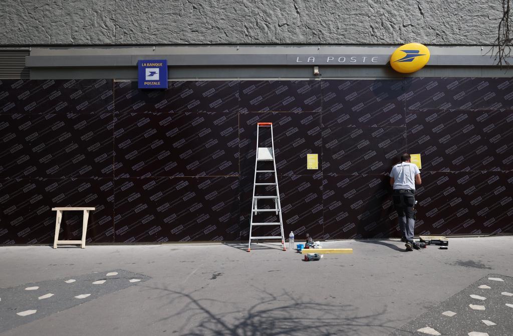 6月30日,在法國(guó)上塞納省楠泰爾市,工作人員為一家郵局加裝防護(hù)板。新華社記者高靜攝
