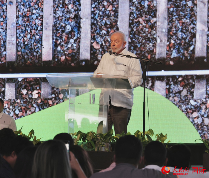 | 巴西總統(tǒng)盧拉在巴西東西鐵路項目開工儀式上發(fā)表致辭。人民網(wǎng)記者 宋亦然攝 |