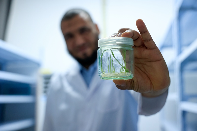 艾哈邁德·埃爾法納展示云南省農(nóng)業(yè)科學(xué)院糧食作物研究所小麥新技術(shù)研發(fā)創(chuàng)新團(tuán)隊(duì)培育的小麥單倍體苗。新華網(wǎng) 趙普凡 攝