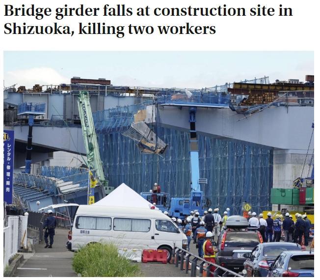 報道稱,當時約20名施工人員在靜岡市國道1號上進行夜間高架橋搭建作業(yè)。長約65米、重約140噸的高架橋鋼架突然折斷,并從約九米高處墜地。當局稱,施工人員當時正在調整鋼架的水平方向。