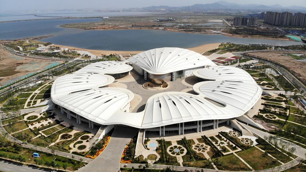 位于中國-上海合作組織地方經(jīng)貿(mào)合作示范區(qū)的青島·上合之珠國際博覽中心。新華社記者 李紫恒 攝