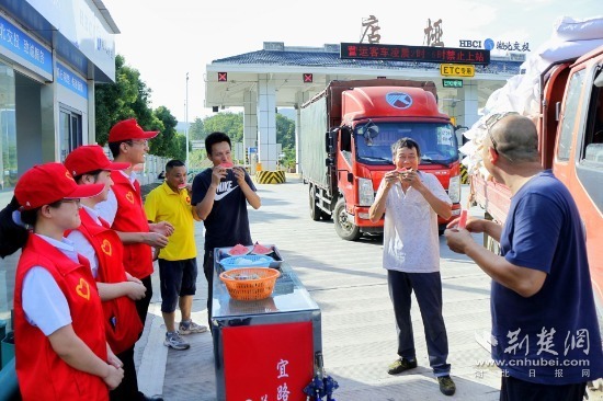 “今天真的太熱了,我們從河南開了好幾個(gè)小時(shí)過來的,現(xiàn)在就想來一口冰爽的,太感謝你們的水果了。”店埡收費(fèi)站“清涼”服務(wù)點(diǎn)內(nèi),收費(fèi)員不僅為司乘們提供綠豆湯、酸梅汁等消暑涼飲,還為有需要的司乘準(zhǔn)備了清涼油、冰絲袖、藿香正氣水等防暑藥品。