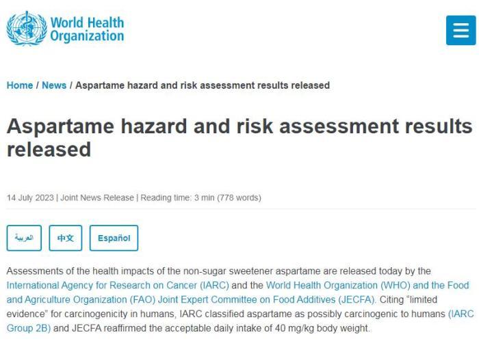 中新網(wǎng)7月14日電 綜合報(bào)道,世界衛(wèi)生組織官網(wǎng)當(dāng)?shù)貢r(shí)間14日發(fā)布相關(guān)評(píng)估結(jié)果,將阿斯巴甜(一種人造甜味劑)列為可能致癌物,但補(bǔ)充說(shuō),如果每天攝入量不超過(guò)每公斤體重40毫克,攝入阿斯巴甜是安全的。
