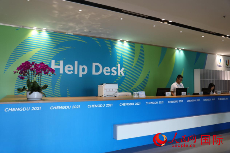 | 成都大運(yùn)會(huì)主媒體中心服務(wù)臺(tái)。人民網(wǎng)記者 符園園攝 |