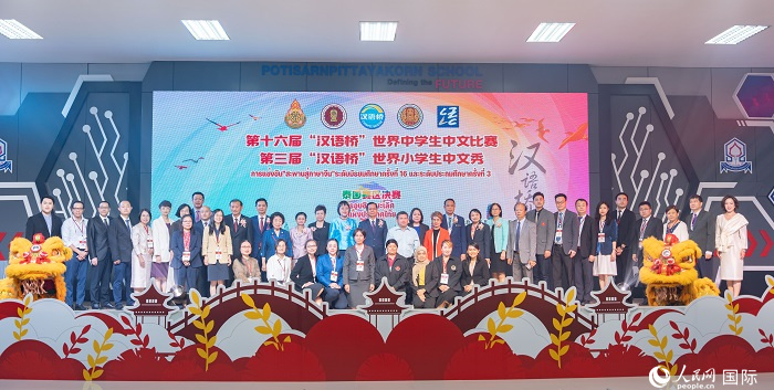 第十六屆“漢語橋”世界中學(xué)生中文比賽、第三屆“漢語橋”世界小學(xué)生中文秀泰國賽區(qū)決賽嘉賓合影。人民網(wǎng)記者 孫廣勇攝