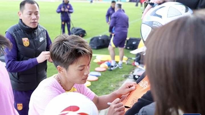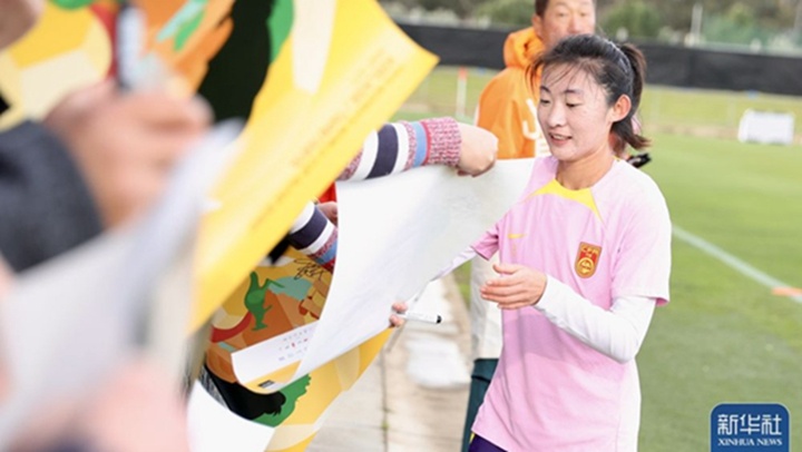 ↑王霜在訓(xùn)練后為球迷簽名。新華社記者丁旭攝