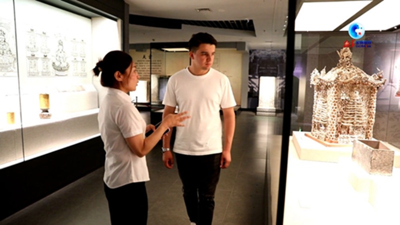 塔吉克斯坦留學(xué)生包伯仲在朝陽市北塔博物館館長王志華的帶領(lǐng)下,游覽北塔一睹國寶級文物的風(fēng)采。