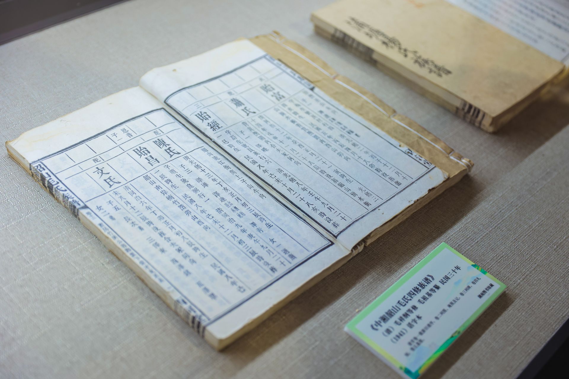 湖北、湖南作為中國近現(xiàn)代新民主革命的重要發(fā)源地,在革命家傳部分,分別展出了毛澤東、劉少奇、彭德懷和陳潭秋等革命先輩的家譜,為厚植家國情懷,傳承紅色基因提供了珍貴資料。其中湖南圖書館《中湘韶山毛氏四修族譜》《寧鄉(xiāng)南塘劉氏四修族譜》,思綏草堂《蒲塘楊氏六修族譜》皆為原件。