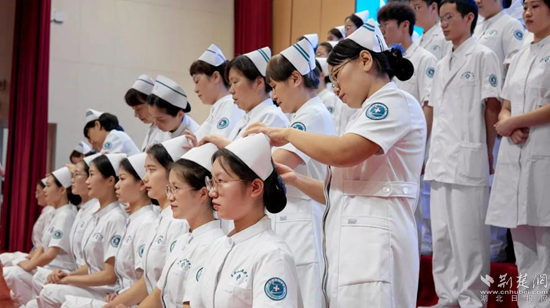 在激昂的黃岡市中心醫(yī)院院歌中,專家前輩和護(hù)士長(zhǎng)代表為新職工們佩戴聽(tīng)診器和燕尾帽,并一起重溫了中國(guó)醫(yī)師宣言和南丁格爾誓詞。新職工們肅然站立、莊嚴(yán)宣誓,鏗鏘有力的誓言久久回蕩。一張張青春洋溢的臉龐,一聲聲莊嚴(yán)的承諾,都詮釋著投身醫(yī)療事業(yè)的無(wú)限榮光。