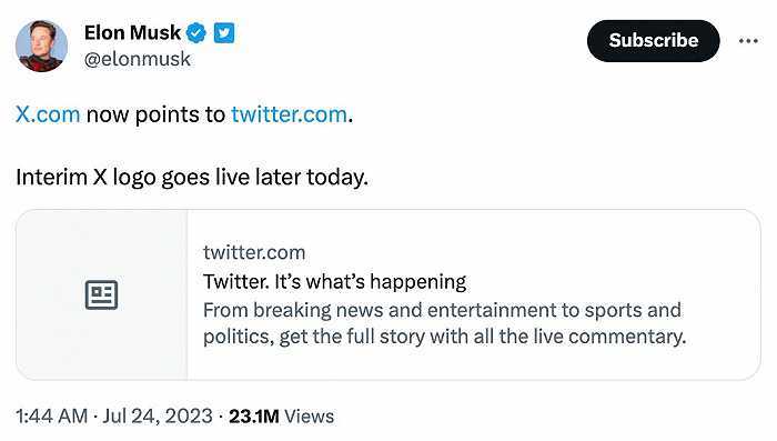 7月24日,馬斯克發(fā)文稱,“X.com現(xiàn)在指向twitter.com,臨時X標志將于今日晚些時候啟用?!?/p>