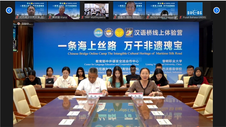 人民網(wǎng)雅加達7月24日電 (記者李培松)7月24日下午,由教育部中外語言交流合作中心主辦、黎明職業(yè)大學和印尼雅加達華文教育協(xié)調(diào)機構(gòu)、印尼峇淡慈容學校聯(lián)合承辦的漢語橋線上體驗營“一條海上絲路,萬千非遺瑰寶”正式開營。雅協(xié)執(zhí)行主席、黎明海絲學院印尼方院長蔡昌杰,印尼峇淡慈容學校初中部校長黃依麗,黎明職業(yè)大學黨委委員、副校長李冬梅出席開營儀式,體驗營的128名營員、黎明職業(yè)大學印尼留學生以及來自雅協(xié)、峇淡慈容學校、峇淡世界大學語言中心、黎明職業(yè)大學相關(guān)職能部門的教師代表參加儀式。儀式由黎明職業(yè)大學林昭永主持。