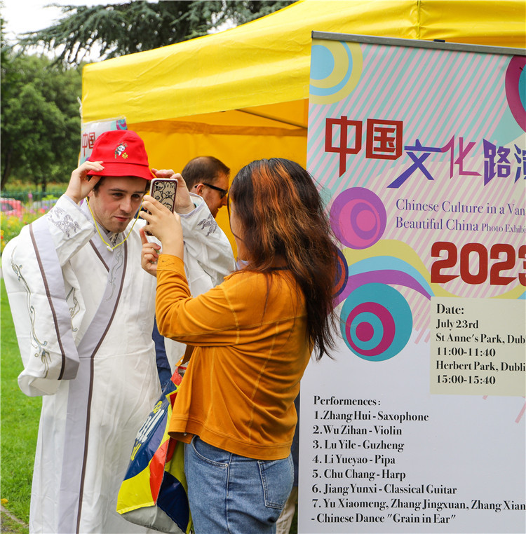 華僑華人文藝團(tuán)隊(duì)利用移動(dòng)舞臺(tái)“大篷車”在都柏林圣安妮公園和赫伯特公園巡演,為當(dāng)?shù)孛癖妿?lái)了古箏、琵琶等音樂(lè)及舞蹈表演,并安排了漢服展示及試穿環(huán)節(jié),觀眾們紛紛興致勃勃地試穿漢服。“美麗中國(guó)”圖片展展出了幾十幅介紹中國(guó)自然環(huán)境和人文景觀的照片,吸引了不少游客駐足。
