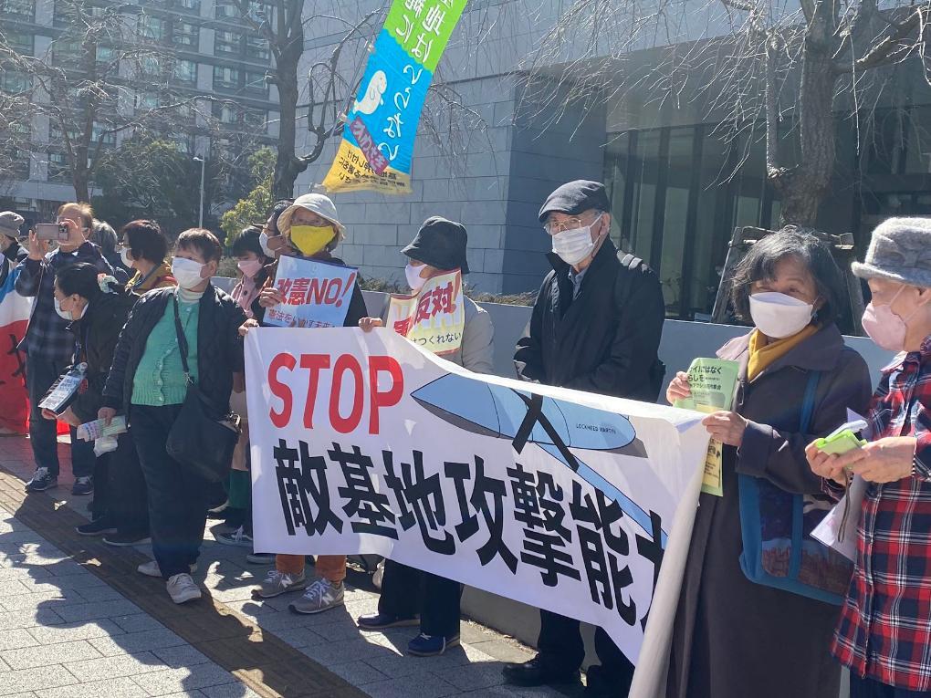 2023年2月28日,在日本東京,日本民眾舉著標(biāo)語牌抗議日本眾議院通過高額的防衛(wèi)費(fèi)預(yù)算案。新華社記者郭丹攝