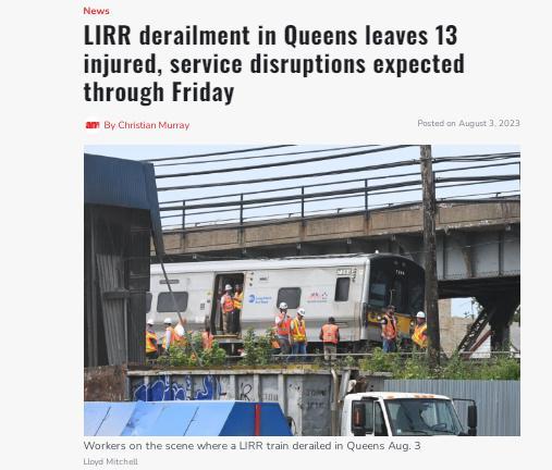 報道稱,當(dāng)?shù)毓賳T介紹,這列隸屬于長島鐵路公司的火車從紐約市中央車站出發(fā),在行至皇后區(qū)牙買加車站附近時發(fā)生事故,所掛八節(jié)車廂全部脫軌。