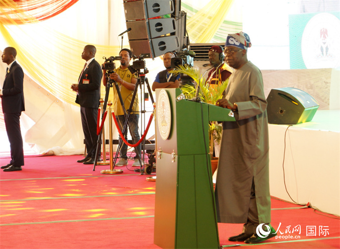 尼日利亞總統(tǒng)提努布致辭。人民網(wǎng)記者 姜宣攝
