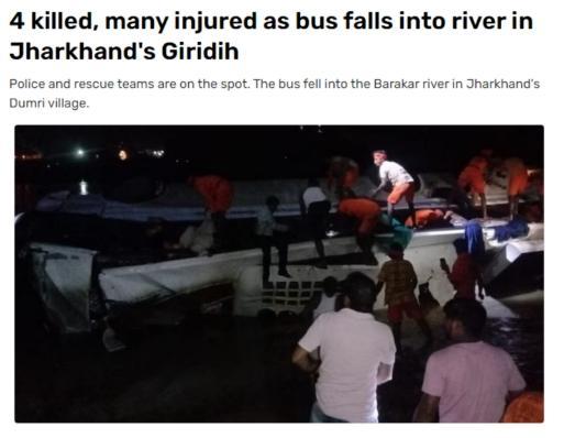 據(jù)報(bào)道,當(dāng)?shù)鼐椒Q,當(dāng)晚8:40約左右,在賈坎德邦(Jharkhand)的吉里迪(Giridih)縣,一輛從蘭契開往吉里迪的大巴車突然撞壞大橋欄桿,隨后墜入河流,橋梁高度約15米,造成至少4人死亡。預(yù)計(jì)還有幾人溺水身亡,救援行動(dòng)正在進(jìn)行中。